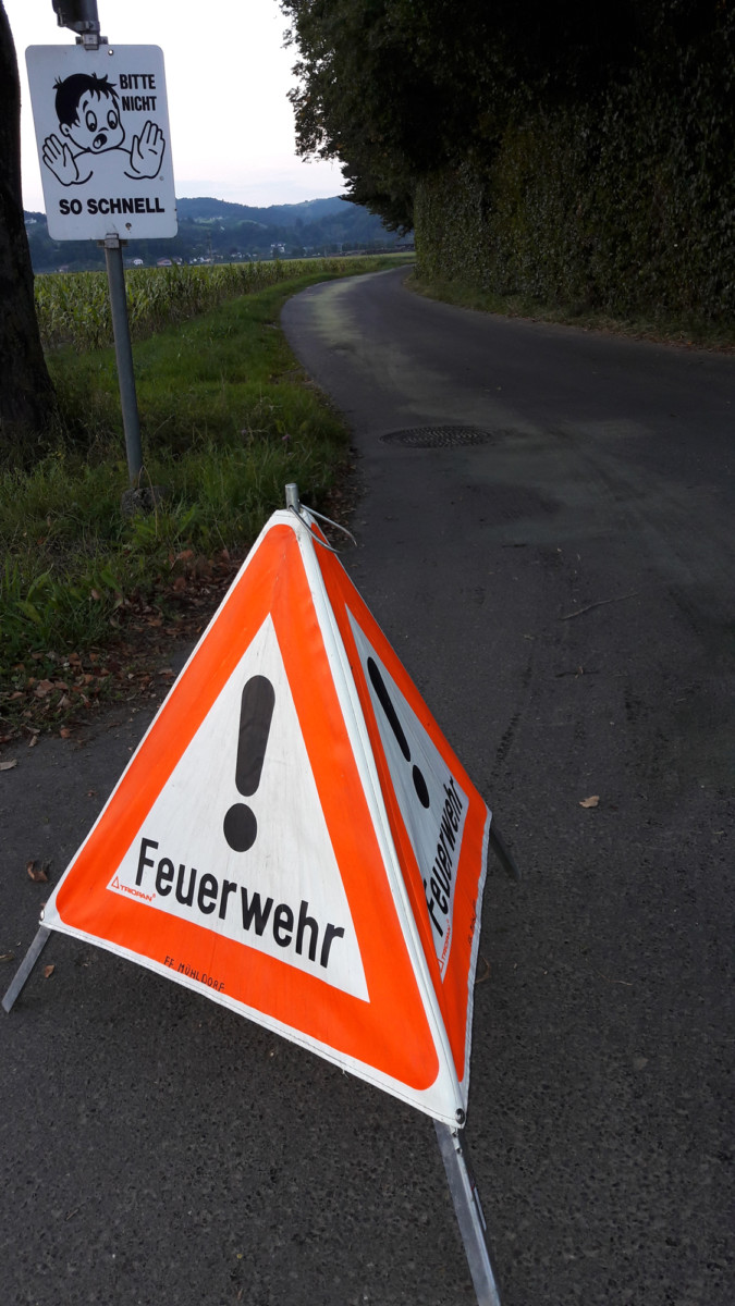 Am 01. September 2016 um 18:43 Uhr wurden wir zu einem technischen Einsatz in Pesenbach gerufen. Ein Bagger hatte auf Grund eines technischen Gebrechens eine ca. 800m lange Ölspur hinterlassen. Die Feuerwehr Mühldorf sicherte die Goldwörther Landesstraße und die Straße „Am Pesenbach“ mit Warndreiecken ab und begann sofort mit dem Aufbringen von Bindemittel. Um die Arbeiten zu erleichtern wurde der abendliche Verkehr auch teilweise umgeleitet oder wechselseitig angehalten. Da es sich bei dem Öl um relativ zähes und rutschiges Motor- oder Getriebeöl handelte, musste zur Reinigung der Straße noch eine Spezialfirma angefordert werden. Das weitläufige Einsatzgebiet wurde zusätzlich mit fünf Ölspur-Warntafeln abgesichert.