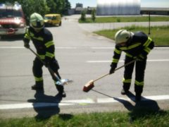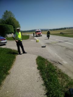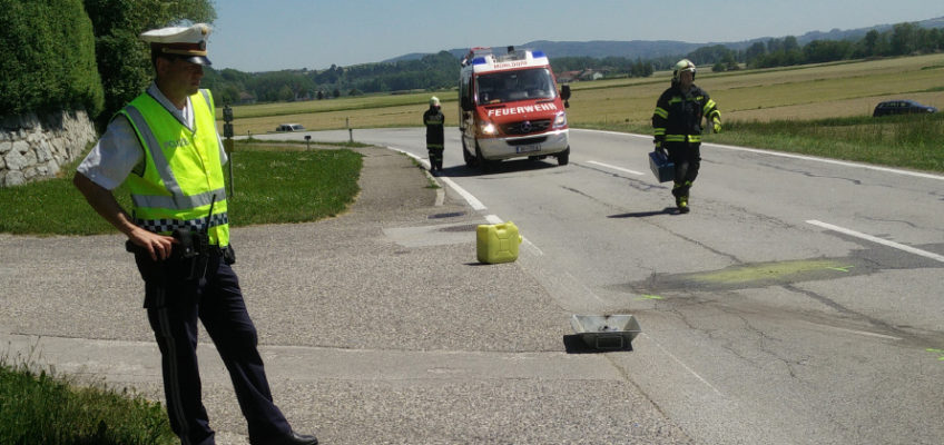 Am 19. Mai um 13:08 Uhr wurde unsere Feuerwehr zur Beseitigung einer Ölspur auf der Aschacher Bundestraße B131 – Höhe Maistrocknungsanlage / Kreuzung Rosenleiten alarmiert. Beim Eintreffen an der Unfallstelle wurde ein Verkehrsunfall mit zwei Fahrzeugen festgestellt. Die Feuerwehr begann sofort mit dem Absichern der Unfallstelle, dem Umleiten des Verkehrs über das Ortsgebiet Pesenbach sowie mit dem Aufbau des Brandschutzes. Eine verletzte Person wurde vom Arbeiter Samariterbund Feldkirchen versorgt und ins Krankenhaus eingeliefert. Nach der Freigabe durch die Polizei wurde mit den Aufräumarbeiten und dem Binden der ausgelaufenen Flüssigkeiten begonnen. Nach dem Aufstellen der Ölspur Warntafeln, konnte die Straße um ca. 13:35 Uhr wieder für den Verkehr freigegeben werden.