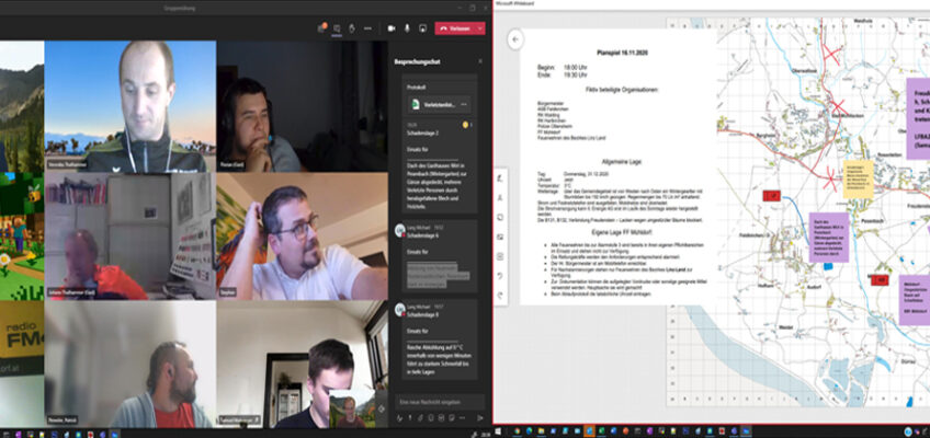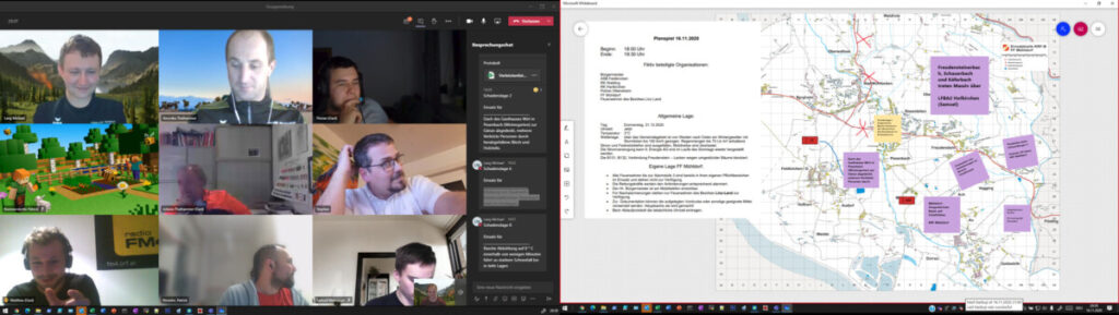 Durch die Vorgaben zur Sicherung der Feuerwehr Einsatzbereitschaft und durch die verschärften COVID-19 Bestimmungen der Bundesregierung, musste die Gruppenübung die am Montag den 16.11.2020 angesetzt war, kurzfristig in den digitalen Raum verlegt werden. Das bereits vorbereitete Planspiel welches einen fiktiven Großschadensfall im Einsatzgebiet unserer Feuerwehr abbildete, konnte mit Unterstützung der einer Videokonferenz Software sehr gut auch online durchgeführt werden. Die 12 Teilnehmer die dabei unterschiedlichen Rollen in der Einsatzführung und Abwicklung Einnahmen, waren entweder über einen PC oder über ein Smartphone eingebunden. Mit diesen einfachen technischen Hilfsmitteln die heute in fast keinem Haushalt mehr fehlen, konnten die vom Übungsleiter via Chat übermittelten Einsatzszenarien und Lagemeldungen alle erfolgreich abgearbeitet werden. Die gesamte Lage wurde dabei auf einem digitalen Whiteboard dargestellt und stand somit allen Teilnehmern zur Verfügung.