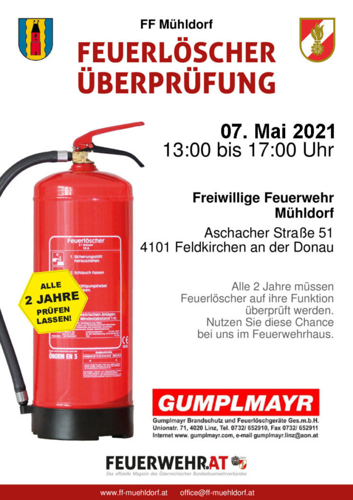 Am Freitag den 07. Mai 2021 konnten zwischen 13:00 Uhr und 17:00 Uhr im Feuerwehrhaus der FF-Mühldorf wieder die regelmäßig vorgeschriebenen Überprüfungen der privaten Feuerlöscher durchgeführt werden. Die Firma Gumplmayr führte diese Prüfungen fachgerecht durch und klebte anschließend die Prüfplaketen auf die einsatzfähigen Geräte der ersten Löschhilfe auf.