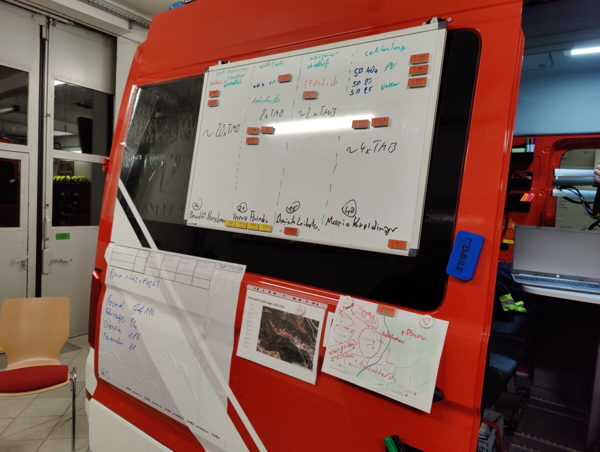 Am 03. Dezember 2024 sind wir der Einladung der FF-Bad Mühllacken zu einer Übungsteilnahme bei ihrem Planspiel gefolgt. In diesem Planspiel wurde ein Großschadensereignis im Ortsgebiet von Bad Mühllacken simuliert, bei dem ein Hagelstrum große Schäden an Dächern und Gebäuden verursacht hatte. Unser neues Kommandofahrzeug wurde in diese Übung als lokale Einsatzleitung eingebunden, um die sehr umfangreiche Einsatzlage gemeinsam mit der Florian Station der FF-Bad Mühllacken und den lokalen Einsatzabschnittsleitern darstellen und bearbeiten zu können. Auch diese Übung, die an das reale Hagelereignis aus dem Jahr 2021 in unserer Nachbargemeinde Walding angelehnt war, brachte wieder wertvolle Erkenntnisse. Im Anschluss gab es für die Kameradinnen und Kameraden der FF-Bad Mühllacken auch noch eine Vorstellung des Fahrzeugs und der technischen Möglichkeiten zur Lageführung und Atemschutzüberwachung.
