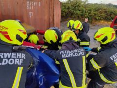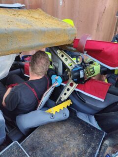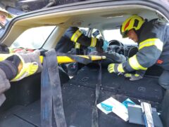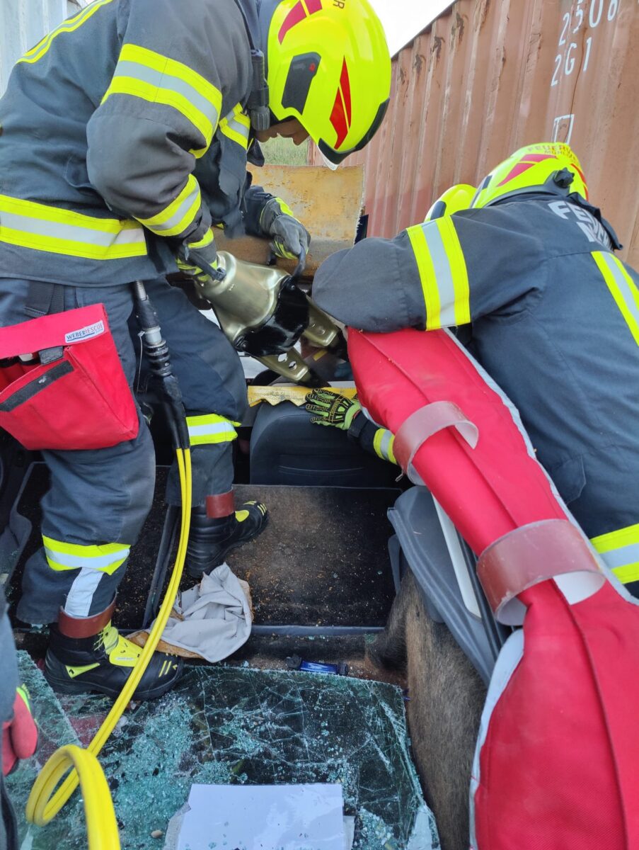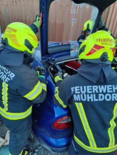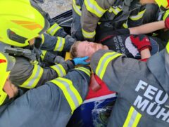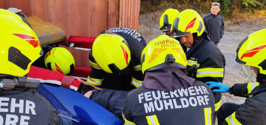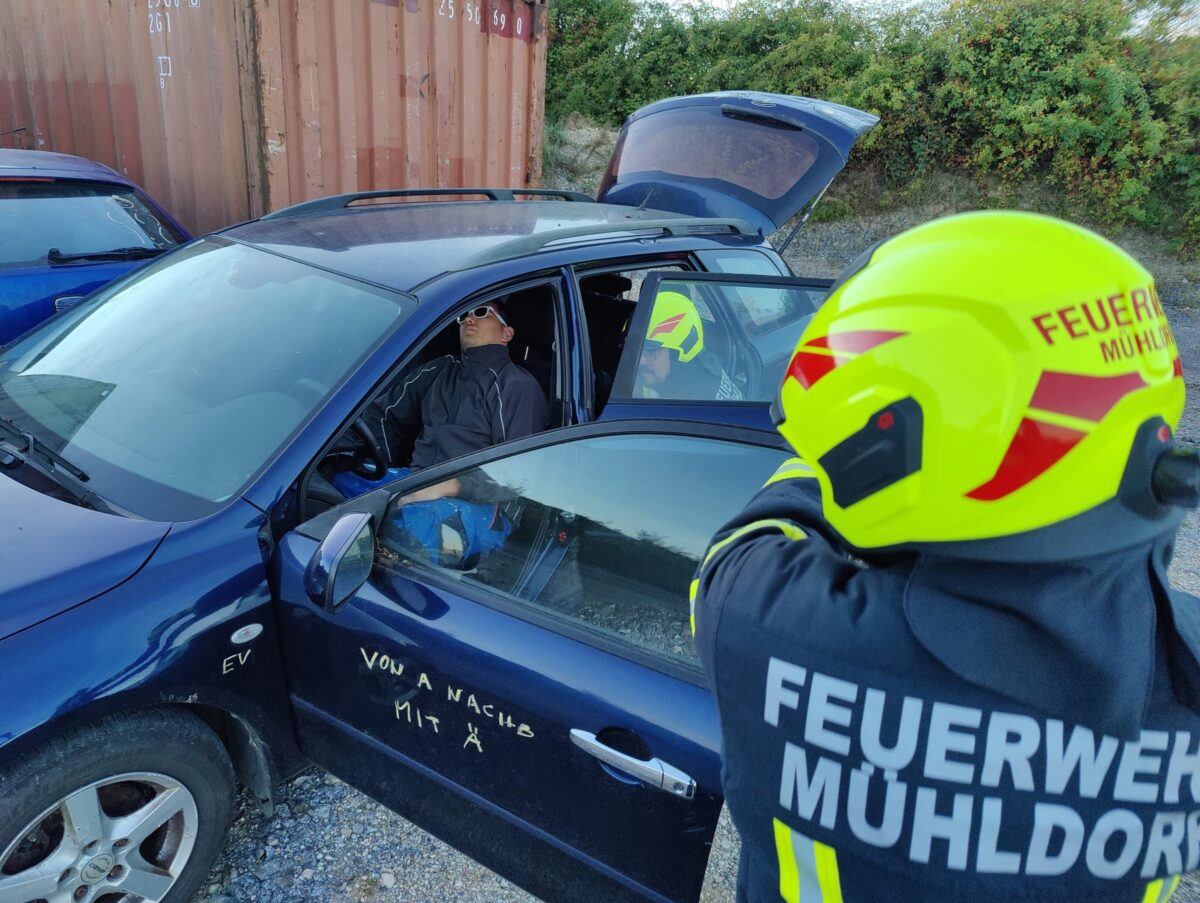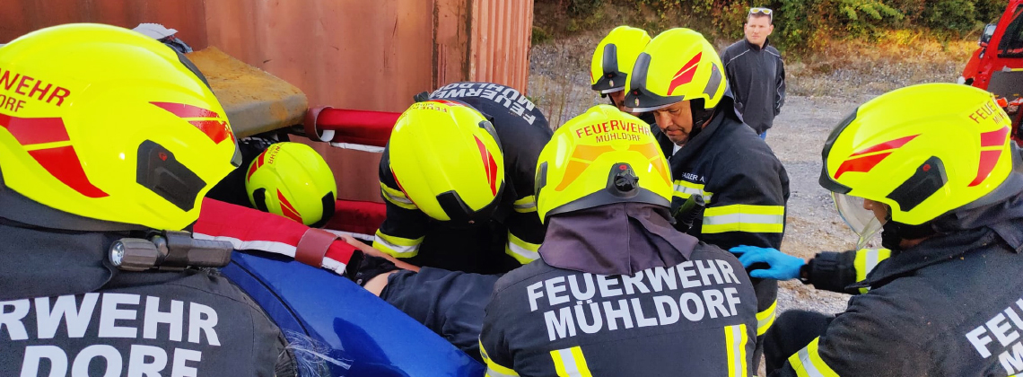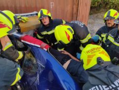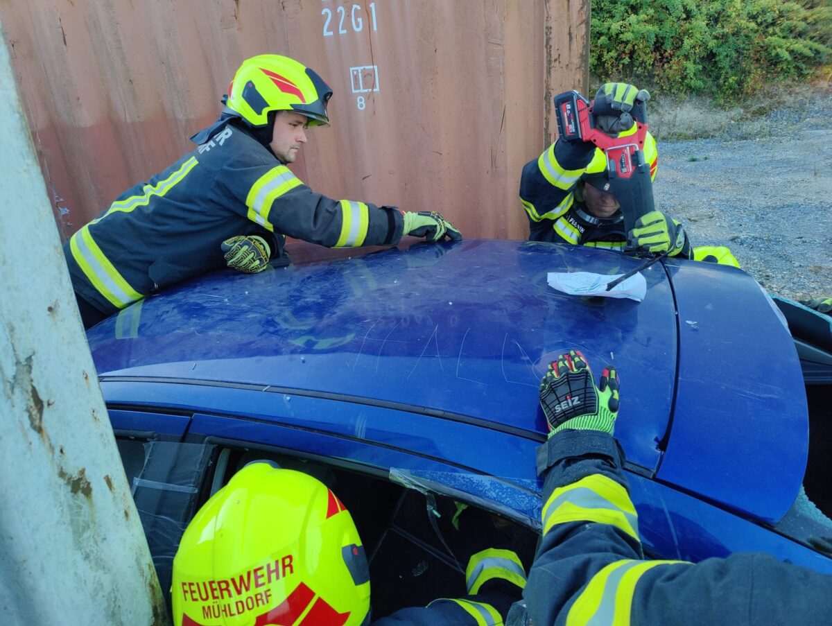 Nach einer kurzen Urlaubs- und Sommerpause starteten wir am Mittwoch den 03.09.2025 mit einer einsatzmäßigen technischen Gruppenübung in den beginnenden Herbst. Übungsannahme war ein Verkehrsunfall mit zwei Fahrzeugen und 3 verletzten bzw. eingeschlossenen Personen. Als zusätzliche Erschwernis der Übungsaufgabe war eines der beiden Fahrzeuge zwischen zwei Gebäudeteilen zum Stehen gekommen, wodurch alle 4 Seiten für eine Rettung blockiert waren. Beim zweiten Unfallfahrzeug handelte es sich zusätzlich um ein Elektrofahrzeug mit Hochvoltsystem, das nur mit Informationen aus den Rettungskarten bewegt werden konnte. Nach dem Eintreffen am Übungsort wurde sofort mit der Absicherung der Unfallstelle begonnen. Der erste Unfalllenker konnte noch relativ einfach aus seinem Kombi gerettet werden. Nach dem Lösen der elektronischen Feststellbremse, konnte dieses Elektrofahrzeugs schließlich entfernt und der Rettungszugang zu den beiden eingeklemmten Personen im zweiten Fahrzeug gelegt werden. Durch öffnen der Kofferraumtür und der Dachkonstruktion, konnten die beiden Verletztendarsteller des zweiten Fahrzeugs schließlich ebenfalls gerettet und den fiktiven Rettungskräften übergeben werden.