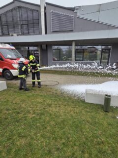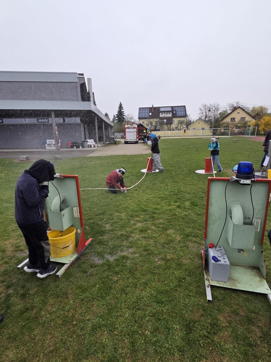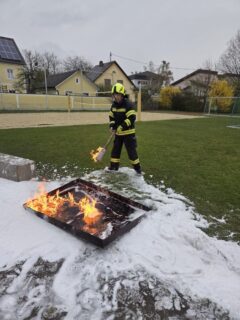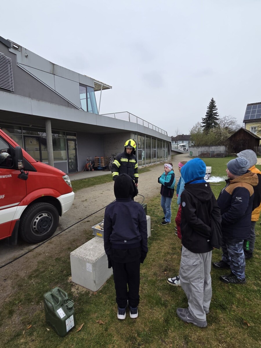 Am 10. April 2026 besuchten wir gemeinsam mit der FF-Feldkirchen, FF-Bad Mühllacken und FF-Landshaag die Volksschule in Feldkirchen. Bei den verschiedenen Stationen konnten wir den begeisterten Kindern die Aufgaben der Feuerwehr, sowie das richtige Verhalten im Brandfall näherbringen. Außerdem durften die Kinder einen Teil der Feuerwehrjugend-Bewerbsbahn mit dem Highlight der Kübelspritze absolvieren. Mit unserem Kleinrüstfahrzeug (KRF-B) waren zusätzlich für die Station Benzinbrand verantwortlich. Gemeinsam mit den Kindern konnten wir diesen Brand von unserem UHPS Hochdruck-Löschsystem mit Löschschaum bekämpfen. Abgesehen vom nassen und kalten Wetter war es ein sehr gelungener Vormittag mit viel Interesse an der Feuerwehr.